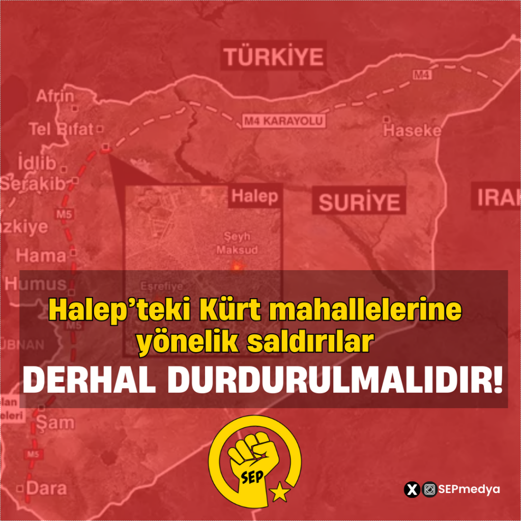 Suriye’de HTŞ rejimi Alevi ve Dürzilerden sonra şimdi de Halep’te yüz binlerce sivilinin yaşadığı Kürt mahallelerine yönelik ağır bir saldırı başlattı. Halep’e yönelik operasyon acilen durdurulmalı ve HTŞ diktatörlüğünün azınlıklar üzerindeki baskıları son bulmalıdır. AKP iktidarının 2011’den beri Suriye’ye yaptığı müdahaleler kan ve gözyaşından başka birşey getirmemiştir, bundan sonra da getireceği yoktur. Suriye’nin geleceği; bölge gericiliklerinin, emperyalist kuvvetlerin ve cihatçı örgütlerin müdahalelerinde değil, halkların eşitlik, özgürlük ve sosyalizm mücadelesindedir!
