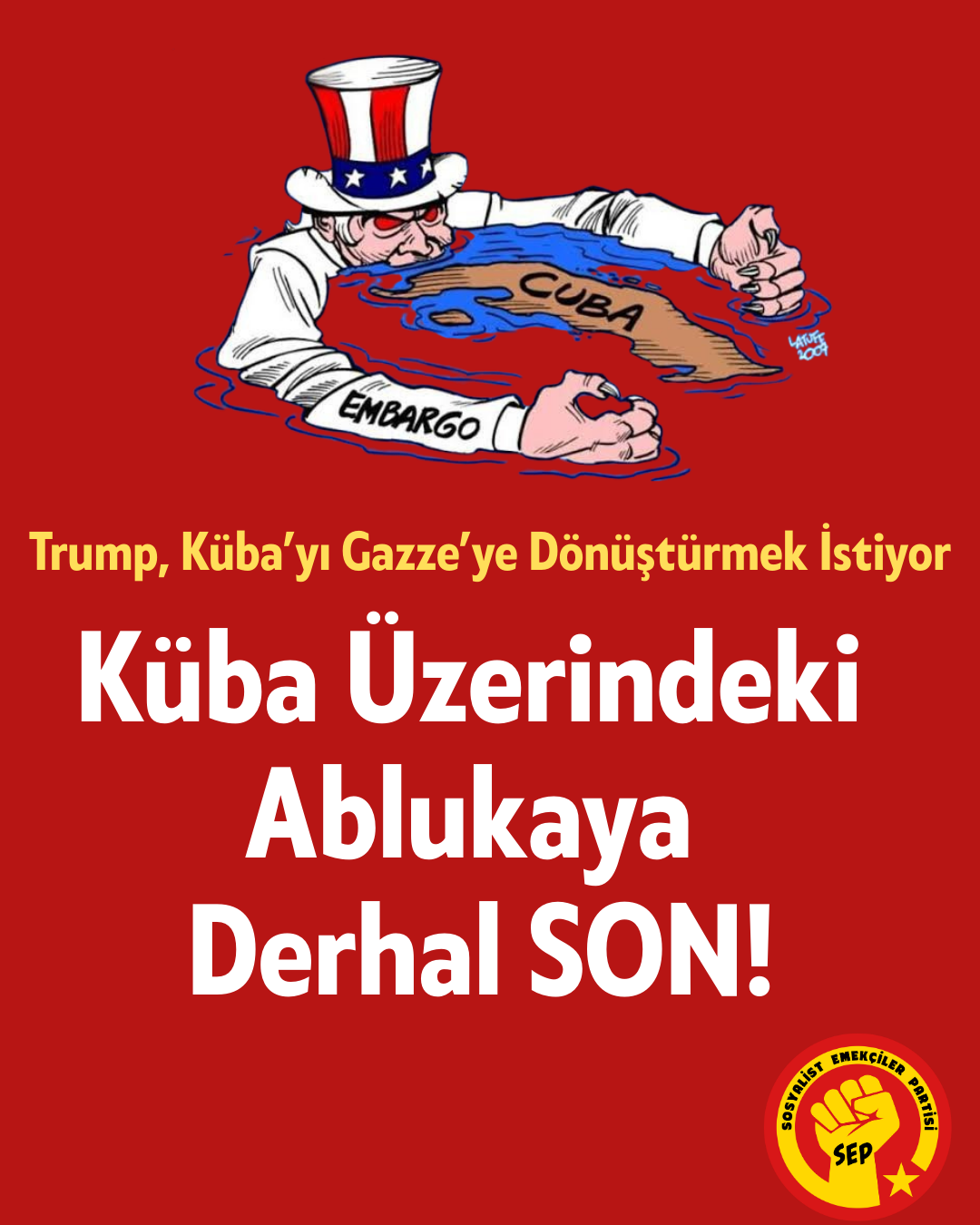 Bir halkı karanlığa mahkum eden, çocukları ilaçsız bırakan ABD emperyalizmine karşı mücadele yoğunlaştırılmalıdır. Küba üzerindeki bu katil abluka derhal kaldırılmalı, hastanelerin ışıkları yanmalı, okullar açılmalı, petrolün önündeki engeller kalkmalıdır. Küba halkının boğazını sıkan emperyalizmin kirli eli derhal çekilmelidir!